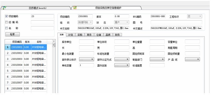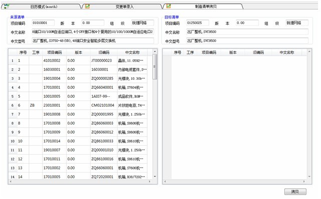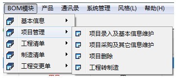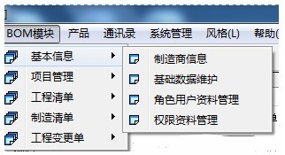 属性查询 、用途反查、制造清单查询、位号查询、变更单查询、制造清单报表、工程清单报表、工程变更报表、制造商资料维护、基础资料维护、项目清单导入、项目拷贝、替代物料反查。