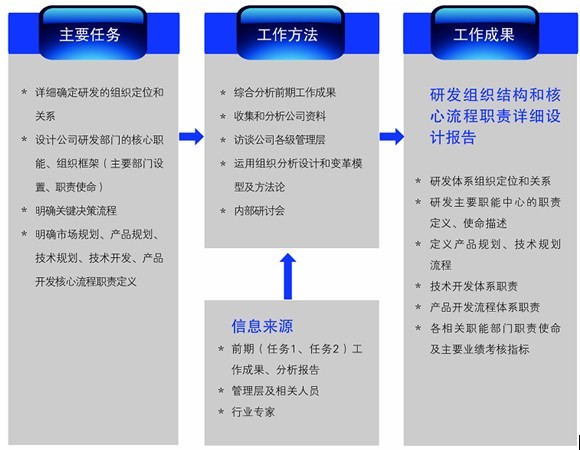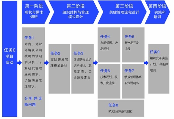 研发管理咨询的四个阶段的任务细分为九个,具体如下: