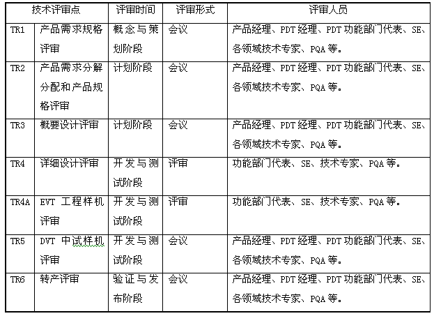 在产品开发过程中,共设置了6个技术评审点,分别为TR1,TR2,TR3,TR4,TR4A,TR5,TR6。