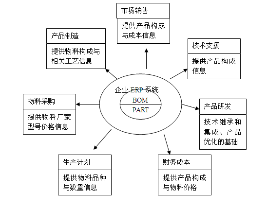 市场销售 提供产品构成与成本信息 技术支援 提供产品构成信息 产品研发 技术继承和集成、产品优化的基础 生产计划 提供物料品种与数量信息 物料采购 提供物料厂家型号价格信息 产品制造 提供物料构成与相关工艺信息 财务成本 提供产品构成与物料价格 企业ERP系统 BOM PART
