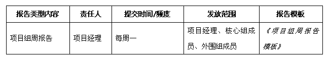 项目报告是保证项目信息上通下达的重要手段,为保证项目信息沟通的有效性和及时性,项目需按照例行报告体系进行。在项目报告体系中,下表内容是必须的: