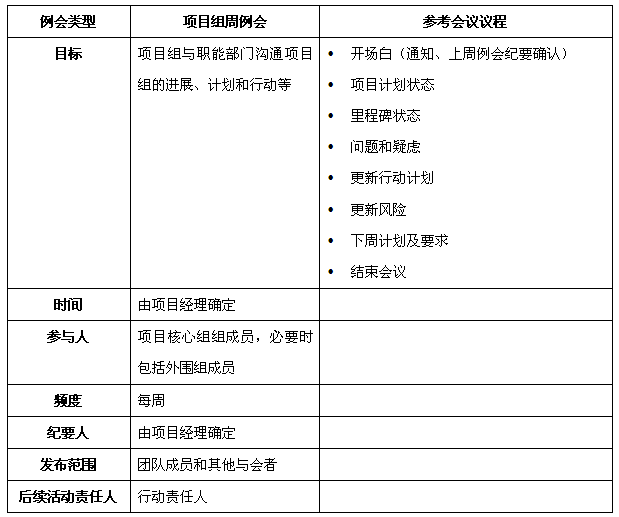 项目例会方式为项目组周例会,例会的具体目标及相关事项见下表。