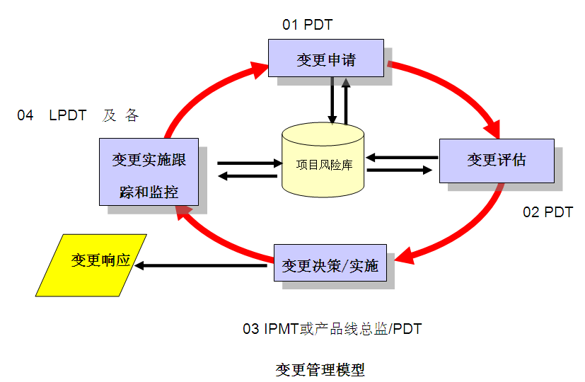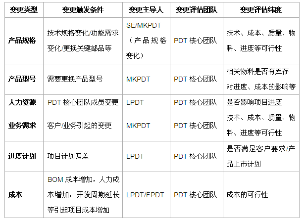 项目实施过程中出现技术难点、人力资源冲突/更换、项目成本偏差等问题,或MKPDT提出产品规格变更等业务变更需求时,为了确保项目的成本、质量及进度,需要PDT核心团队经过详细评估后才能实施变更,项目变更的评估由LPDT组织PDT团队从技术、质量、成本、进度可行性进行全面评估确认,然后视变更的类型及影响程度提交《项目变更通知》由产品线总监签批或IPMT决策通过后实施变更。